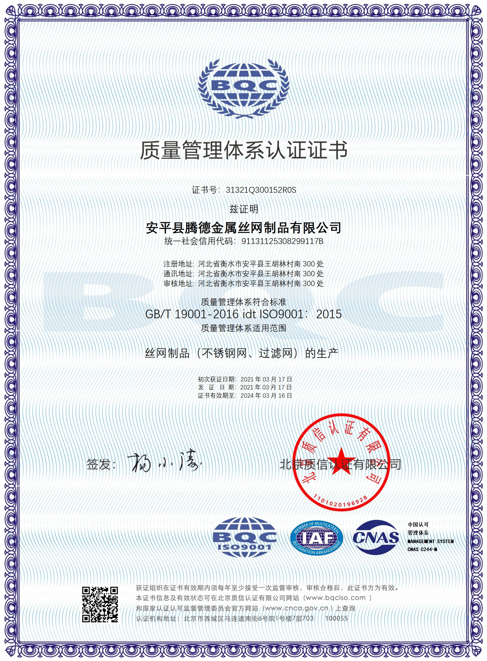 安平县腾德金属丝网制品有限公司20年专注于丝网产品的生产及研发是集生产加工、经销批发为一体的综合部门,不锈钢网系列、丝网制品系列、滤芯滤材是安平县腾德金属丝网制品有限公司的主营产品,并可依客户需要按照客户要求生产各种异形网类、网深加工制品,我们出厂产品全部经过严格检验,确保出厂产品百分百合格。 公司以“科技领先,品质取胜”为经营理念,拥有中高级专业技术人员近百名,具有较强的研…