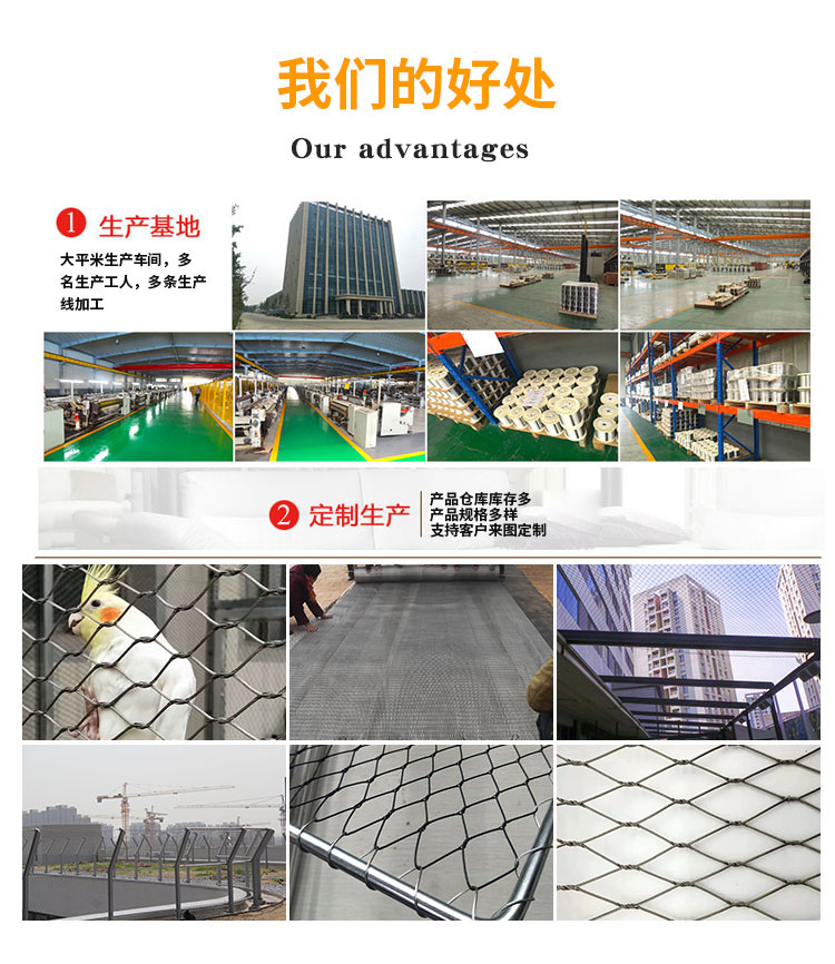 不锈钢绳网是由304、304L、316、316L工艺分为手工编织,封闭口型,开口扣型,不锈钢绳网适用于桥梁围栏、动物园、野生动物园、海洋公园、体育、杂技、家居装饰、建筑装饰等多个领域。