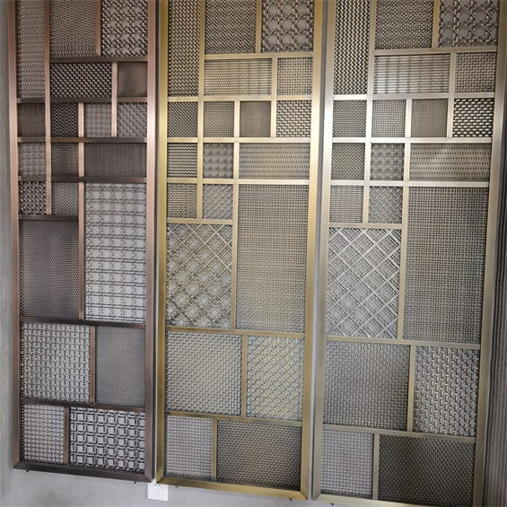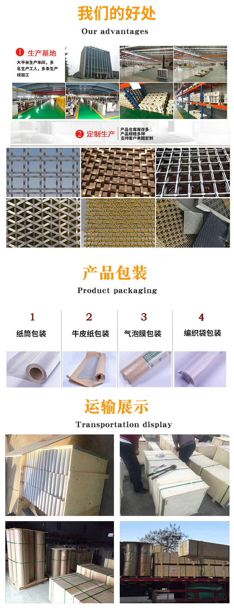 同时还可以生产以铜或铝合金为原材料的金属装饰网,成品可以是金属本来的颜色,也可以喷图成古铜,黄铜,紫铜枣红或其他颜色,高度可以根据需要特殊制作。现在可用于装饰网的网种有:勾花网,环形网带,脚踏网,轧花网,合股网。
