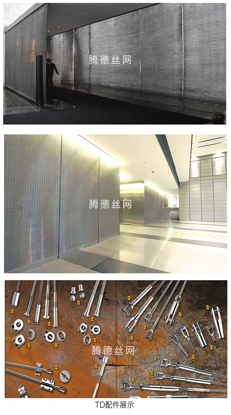幕墙金属装饰网采用棒材或金属缆线编织构成,按照织物的编织形式,由横向金属棒材穿过竖向金属缆线构成的各种图案,使用的材料包括不锈钢和高强度铬钢等金属。主要用作幕墙网,装饰效果生动、外形别致,典雅。不同光线,不同环境,不同时间段,不同观察角度,其视觉效果十分丰富,彰显典雅气质,非凡个性,高贵品位。