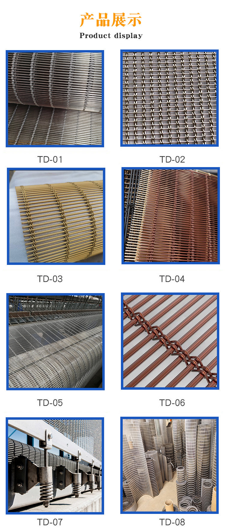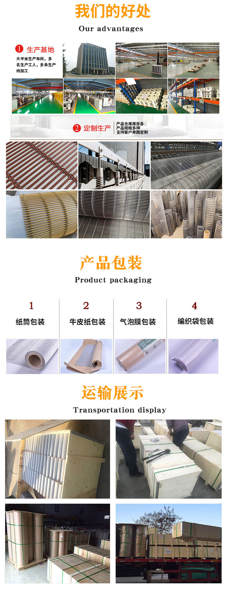 幕墙金属装饰网可以是金属本来的颜色,也可以喷涂成古铜,黄铜,紫铜枣红等其他颜色,高度可以随意定。 幕墙金属装饰网是一种新型建筑装饰材料,采用不锈钢,铝合金,等合金材料,经特殊工艺编制而成,因其具有金属丝和金属线条特有的柔韧性和光泽度被广泛应用于建筑物的立面、隔断、吊顶、以及机场车站、宾馆酒店、歌剧院、展厅等高档内外装修。装饰效果生动、外形别致,典雅。不同光线,不同环境,不同时间段,不同观察角度,其视觉效果十分丰富,彰显典雅气质,非凡个性,高贵品位。