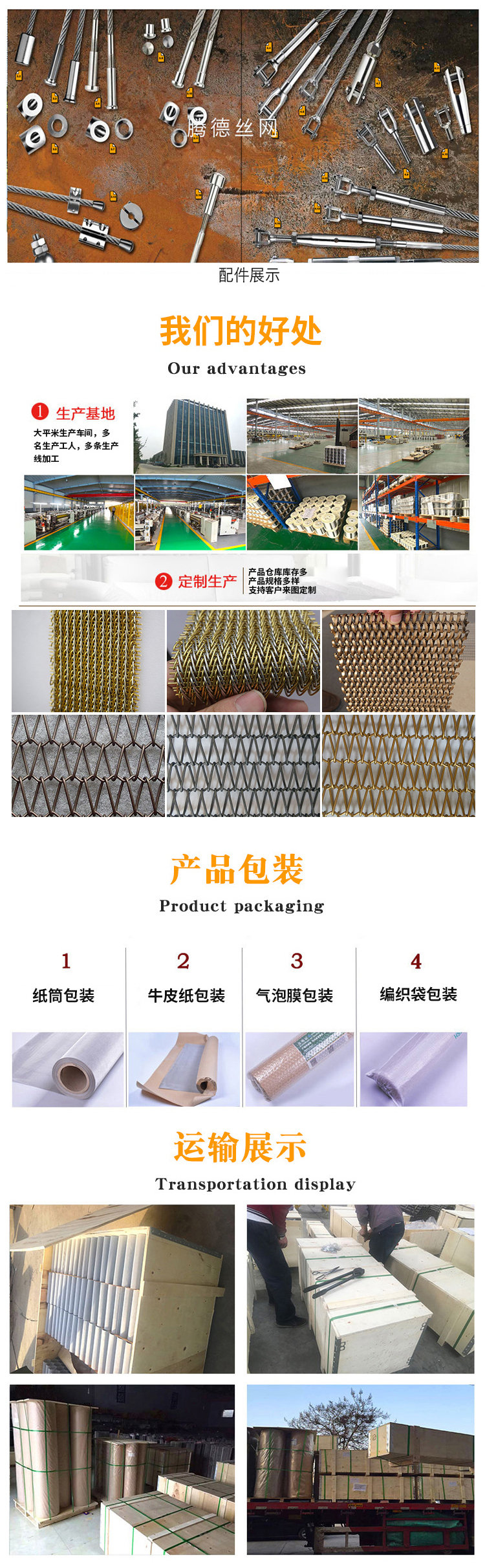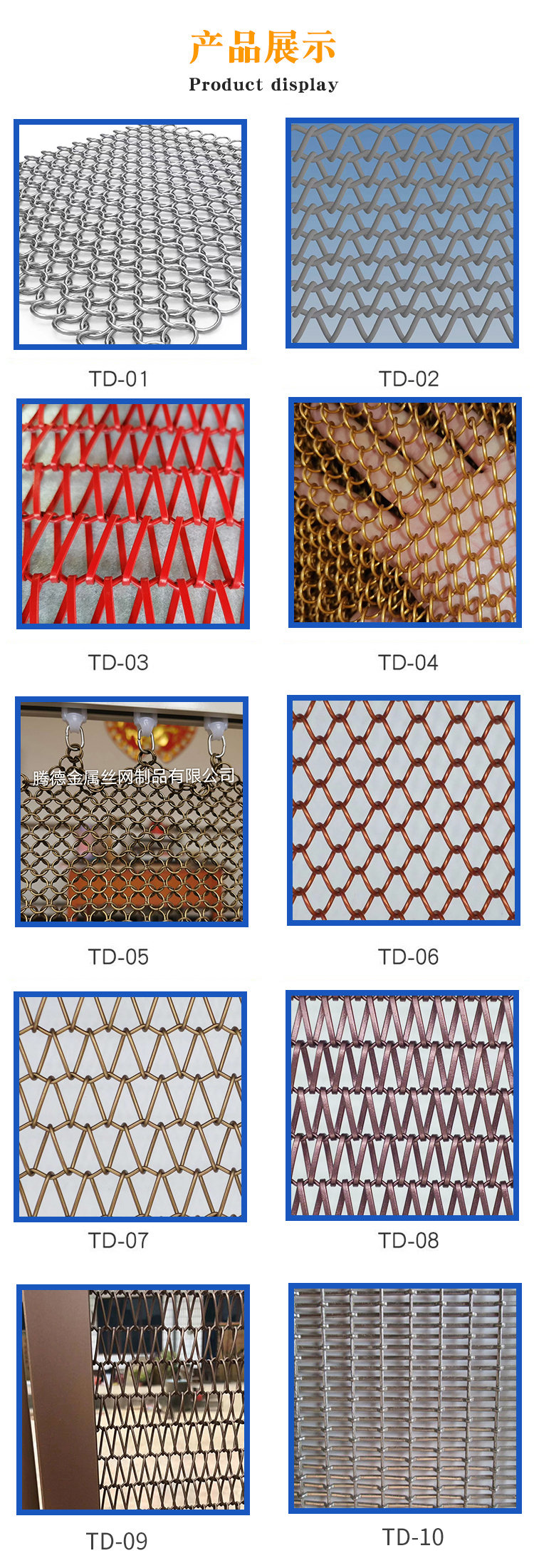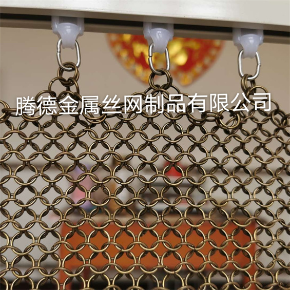 金属网帘采用优质不锈钢,铝合金,黄铜,紫铜等合金材料,采用螺旋套编方式,下垂度好,能打褶,像窗帘一样活动自如,因其具有金属丝和金属线条特有的柔韧性和光泽度,也直接造就了不同的现在金属装饰的艺术风格,挂帘颜色多变,在光的折射下,想象空间无限,美丽尽收眼底。金属垂帘用于墙面的掩盖装饰,室内的隔断装饰,柱子的覆面装饰,天花的立体装饰,是透明的,能打摺的,可以让光和空气通过的,利用光和颜色,想象无限空间,大小任意,色彩很广。